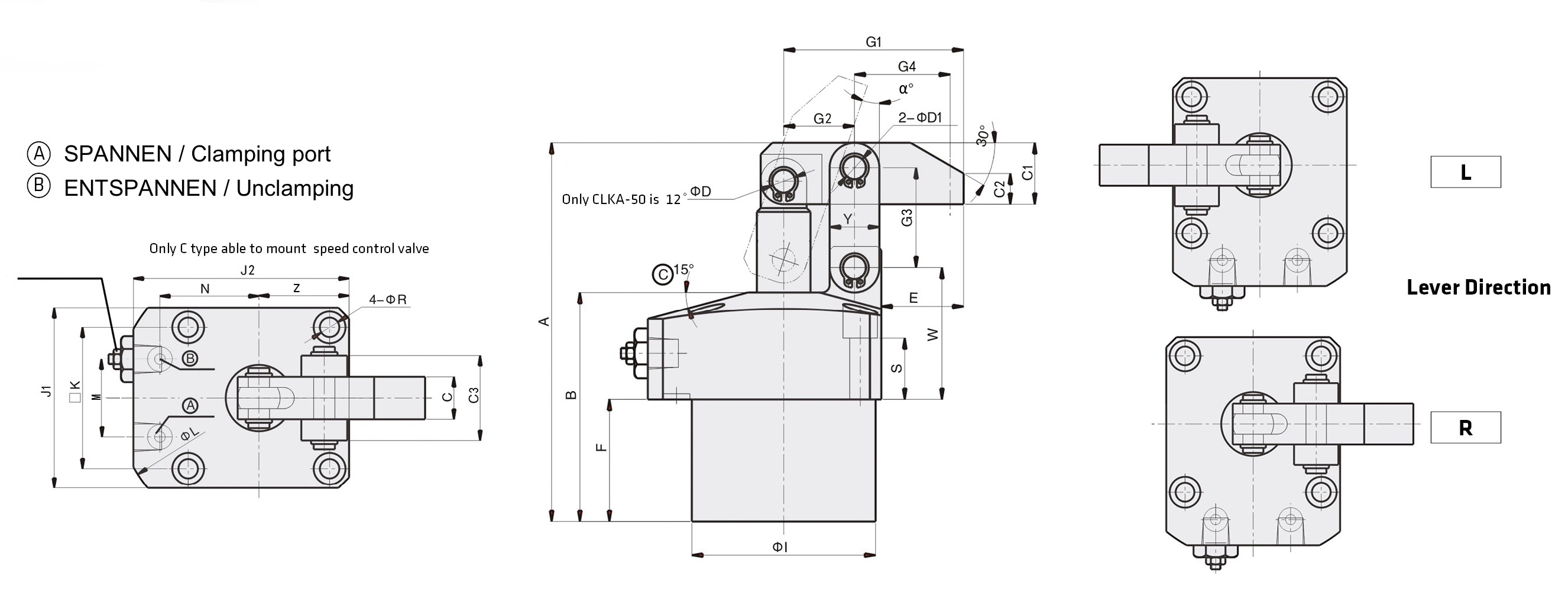| MODEL | A | J2 | J1 | I | B | F | C | Z | K | L | C1 | C2 | N | M | Q | R | S | W | G3 | Y | C3 | G2 | D | D1 | G1 | α | E | G4 | øU | Rohrleitungs- anschluss | O-Ring- Anschluss |