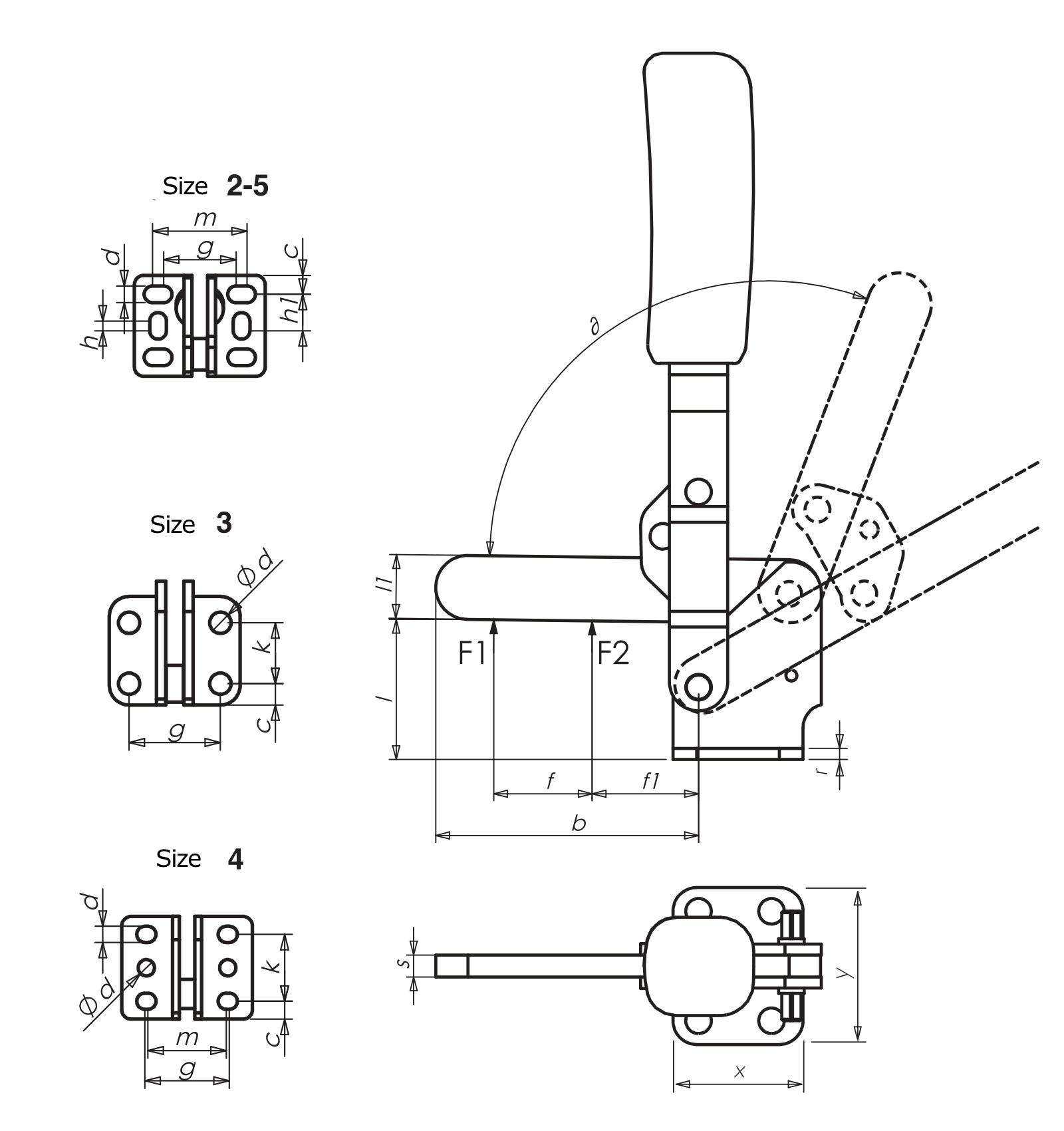 | Size | F1 ⇧ [kN] | F2 ⇧ [kN] | Total height | Total length | Clamping screw | Weight [g] | Price [EUR] | Order- No. |